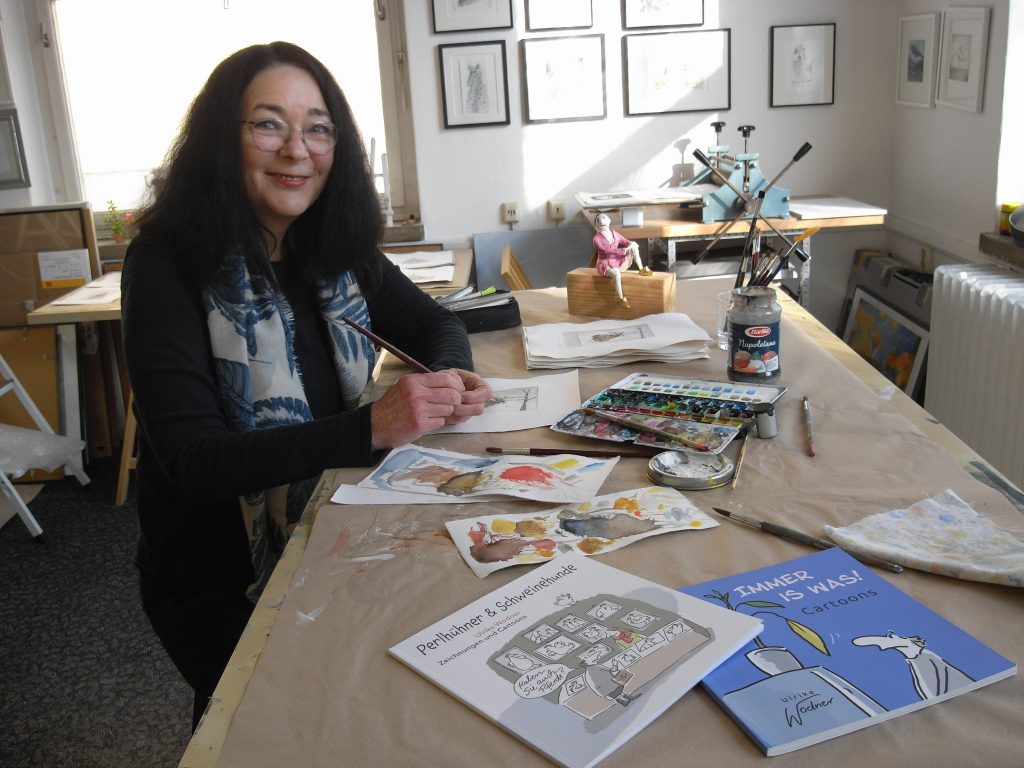 Ich arbeite in Leipzig als Cartoonistin und Zeichnerin und in freier Mitarbeit als Grafik-Designerin für den RBB und MDR.